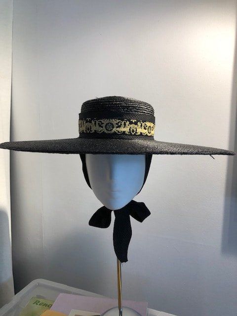 Oversized black braid straw boater. Brim is a whopping 6 inches wide. Vintage black ribbon has been used for the ties that tie securely under the chin. A regal ribbon trim completes the look.