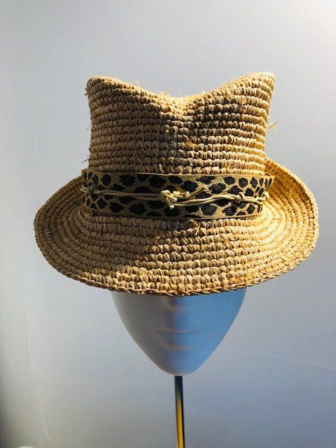 Natural raffia straw funky modern take on a fedora with a stingy brim. Trimmed with leopard print ribbon and knotted cord.