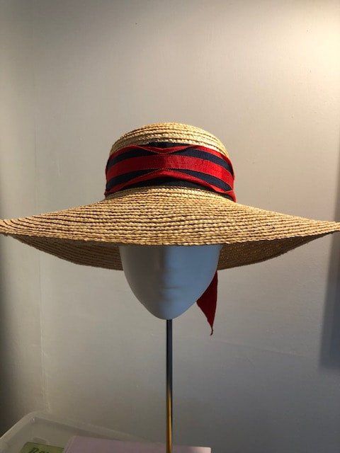 Large natural braid straw picture hat. Brim is 5 inches wide. Hand sewn vintage grosgrain ribbon with ties completes the look. Great for summer
