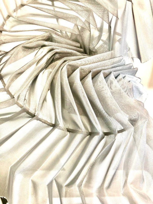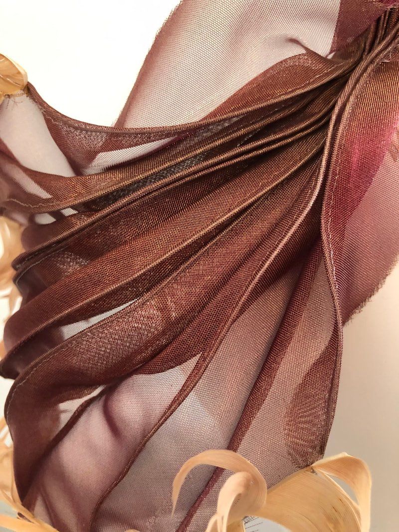 Sweeping asymmetric pleated crinoline trimmed with feather detail and mounted on a handmade wire headband with comb attachment.